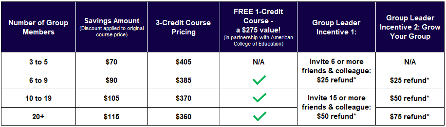 - Each group member in a qualifying group of six or more will earn a free 1-credit course* (a $275 value). Select from two available 1-credit courses following the group close date.